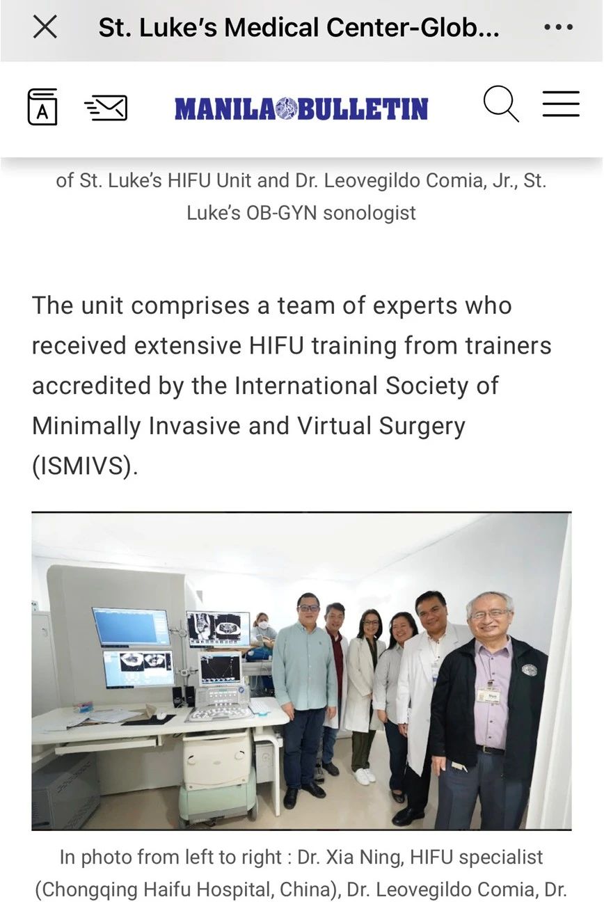 St Lukes医院被公认为菲律宾领先的医疗机构,是全国首家通过JCI认证的学术型医学中心医院。在菲律宾,微创技术并不普及,大多数子宫肌瘤、子宫腺肌病患者只能采取开腹的传统治疗,而"达芬奇"手术的高昂费用也让众多患者望而却步,St Lukes医院希望海扶刀®的引进可以帮助本国患者享有更美好的无创治疗。