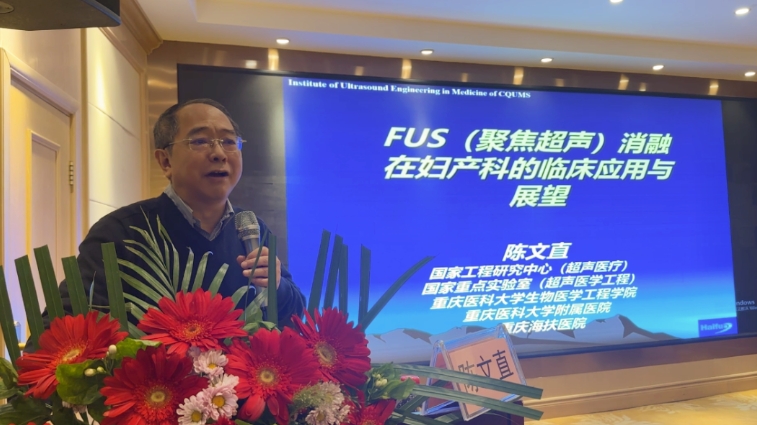 在学术交流环节,陈教授做"FUS(聚焦超声)消融在妇产科的临床应用与展望"的学术讲座,向与会者介绍了聚焦超声消融在治疗子宫肌瘤、子宫腺肌病以及肝癌、胰腺癌、骨肿瘤等恶性肿瘤的临床应用和效果引发大家的强烈关注。
