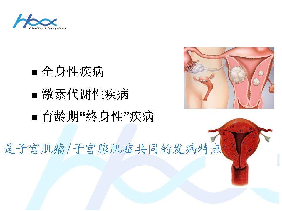 子宫肌瘤和子宫腺肌症是育龄期女性妇科常见病、多发病,随着诊疗技术的不断发展,治疗方案开始不断的优化。同时,随着人们对子宫肌瘤和腺肌症研究不断深入,我们开始慢慢认识认识到,子宫肌瘤和腺肌症是全身性疾病、激素代谢性疾病、育龄期“终身性”疾病。