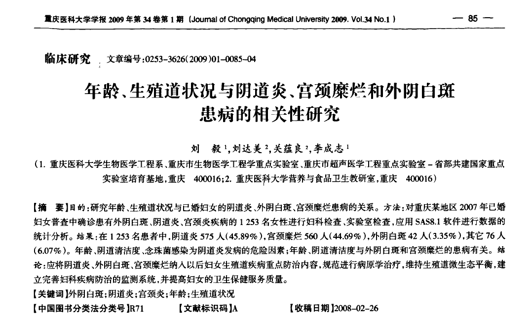 方法:对重庆某地区2007年已婚妇女普查中确诊患有外阴白斑、阴道炎、宫颈炎疾病的1253名女性进行妇科检查、实验室检查,应用SAS8.1软件进行数据的统计分析。