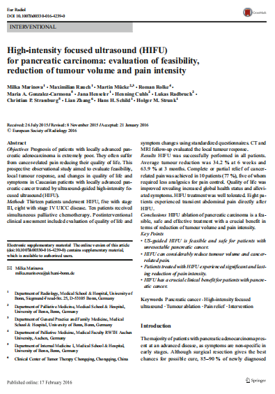 晚期局部胰腺癌预后极差,患者经常遭受癌症引起的疼痛折磨,生活质量严重下降。本前瞻性观察研究旨在评估超声引导下高强度聚焦超声(HIFU)治疗晚期局部胰腺癌在白种人患者中的可行性、局部肿瘤反应以及生存质量和症状的变化。