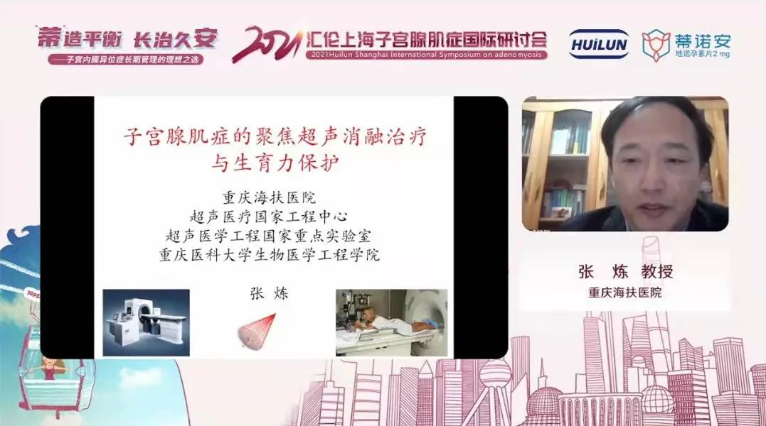 重庆海扶医院院长张炼教授受邀在线进行了题为《子宫腺肌症的聚焦超声消融治疗与生育力保护》的发言。张教授谈到,超声消融治疗子宫腺肌病可迅速有效地改善患者痛经和月经过多的症状,提高患者生活质量。对于有生育需求的患者可改善子宫环境,提高患者生育能力。针对不同类型的子宫腺肌病患者,制定不同的治疗方案。张教授并就腺肌病慢病综合管理方案等问题同与会专家进行了深入交流。