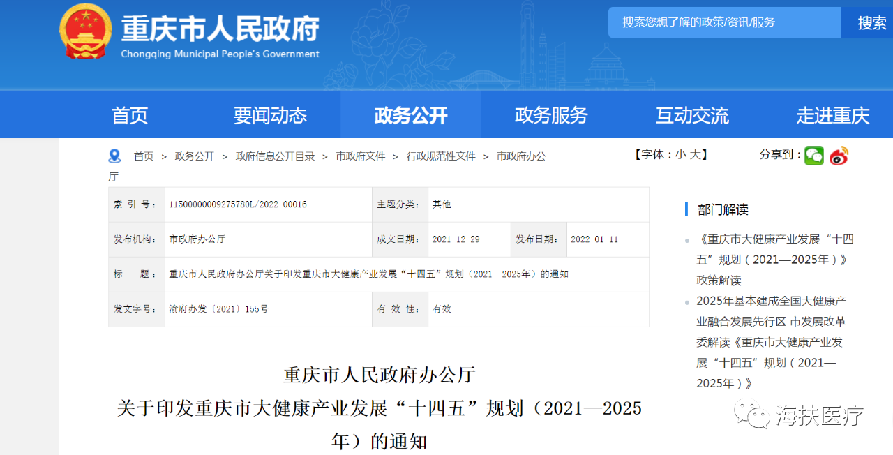 近日,重庆市人民政府办公厅发布《关于印发重庆市大健康产业发展“十四五”规划(2021—2025年)的通知》(渝府办发〔2021〕155号,以下简称《规划》)。