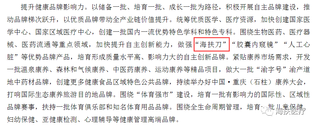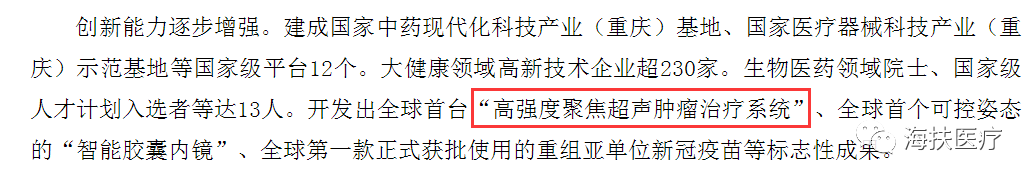 《规划》中指出,目前重庆已建成国家中药现代化科技产业(重庆)基地、国家医疗器械科技产业(重庆)示范基地等国家级平台12个。大健康领域高新技术企业超230家。生物医药领域院士、国家级人才计划入选者等达13人。其中,重点提到研发出全球首台“高强度聚焦超声肿瘤治疗系统”是标志性成果之一。
