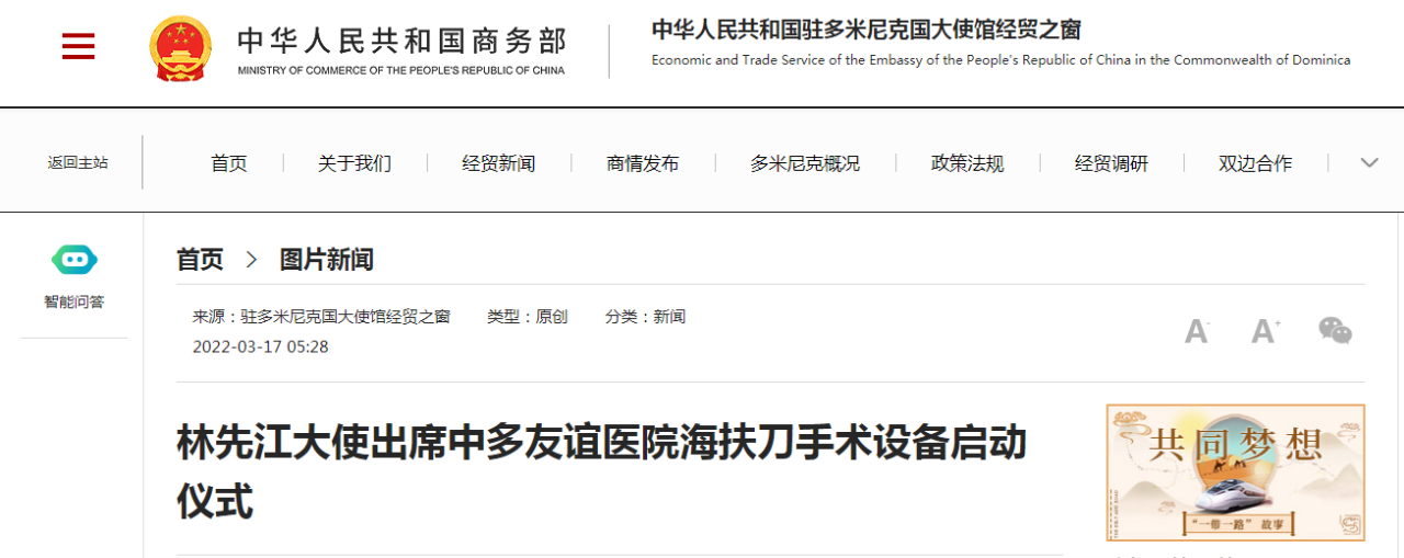 2022年3月16日,中国驻多米尼克大使林先江和多卫生部长麦金泰尔共同出席了在中多友谊医院举行的中国政府捐赠的海扶刀®手术设备启动仪式。