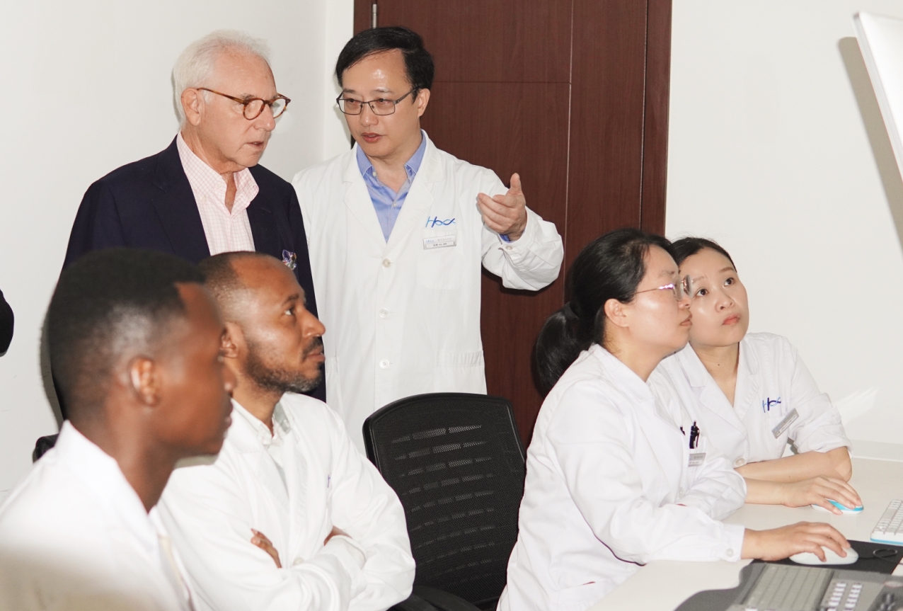 在聚焦超声消融手术室,Dr. Kassell一行观摩了一例子宫肌瘤和一例子宫腺肌病的治疗;在聚焦超声消融手术全球协同服务中心,张院长介绍了海扶医院与全球200余家海扶中心的医生能够在线实时连接,实现经验共享、相互交流、远程指导。