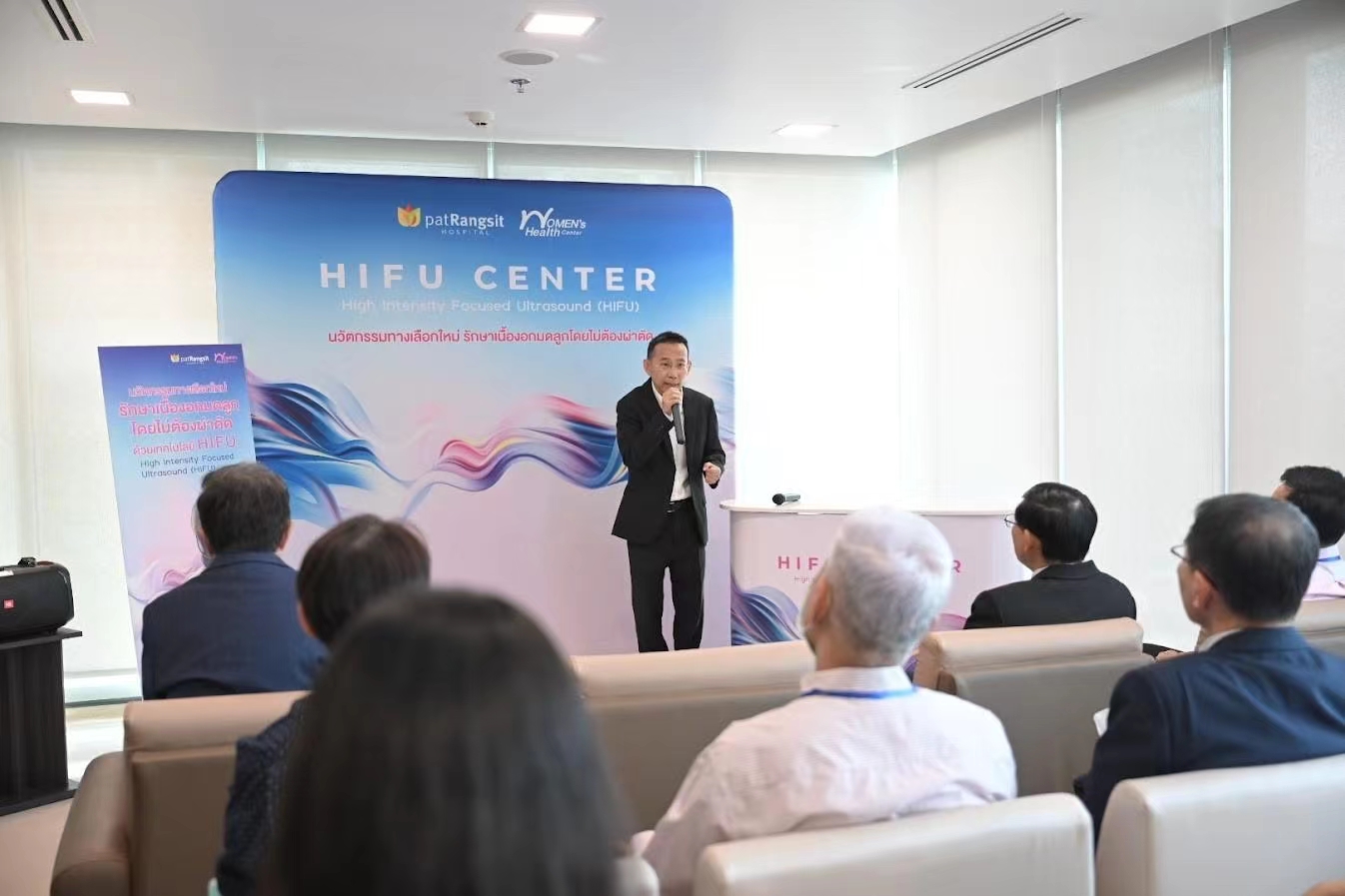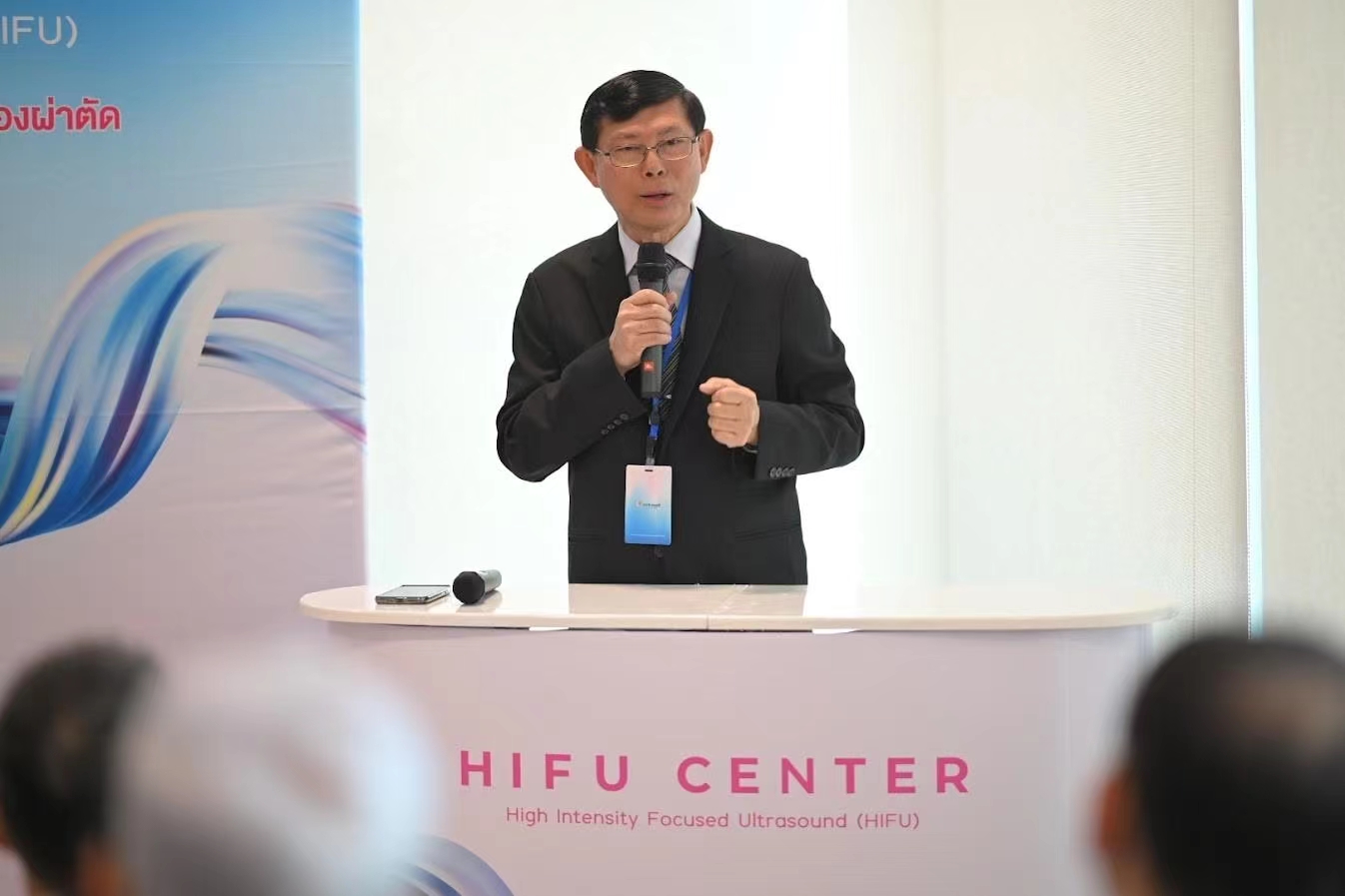 开机仪式及培训启动会上,泰国皇家妇产科学会(RTCOG)主席Prof. Vitaya titapant和兰实医院CEO,Ronnachit Yaemsaard致辞,表示微无创治疗是未来医学发展的方向,感谢重庆海扶医院派出的精英团队给与兰实医院的大力支持,相信聚焦超声消融可以保护子宫,保护生育,为更多泰国患者提供无创的治疗方式和优质的医疗服务。