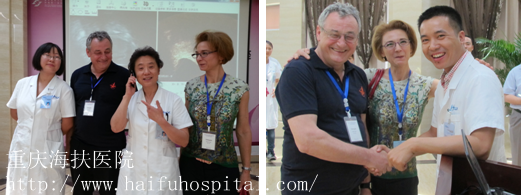 会后,两位罗马尼亚医生热切地询问我们是否认识邓勇斌医生,原来当年就是邓勇斌医生到罗马尼亚指导他们当地医生学习超声消融临床操作的。得知邓医生现在就在海扶医院,他显得异常高兴,并现场与邓医生等合影留念。这位医生激动地拉着邓勇斌医生的手对我们说:“This is my teacher,also is my friend!”